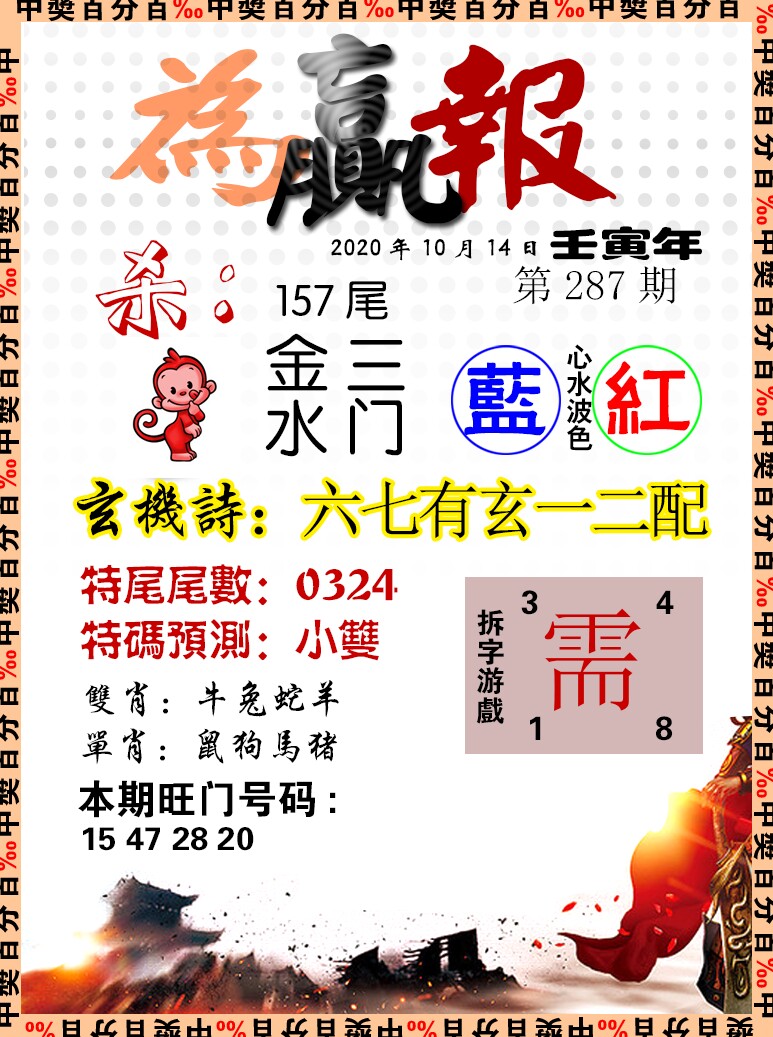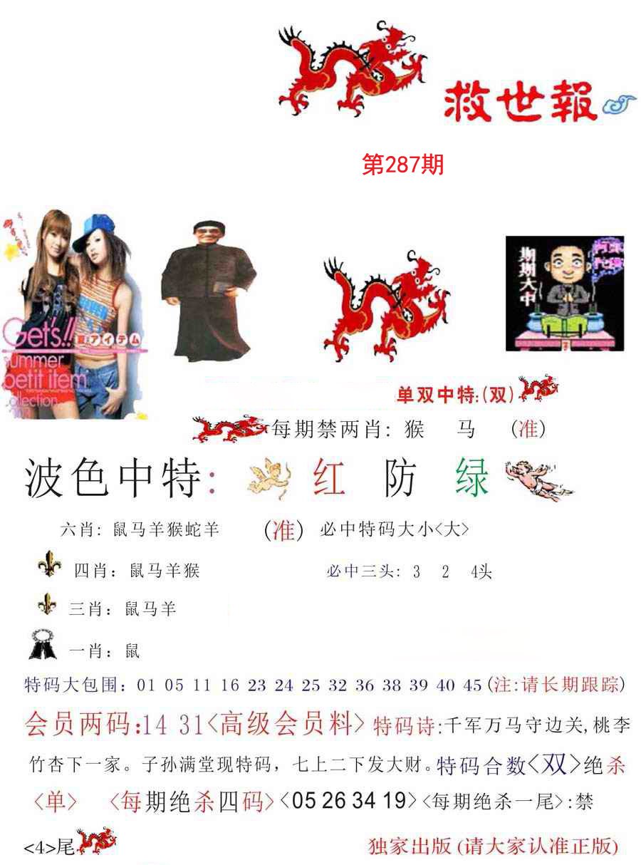 287期绝杀中特【狗肖-2头-3尾-单数】开?00 |